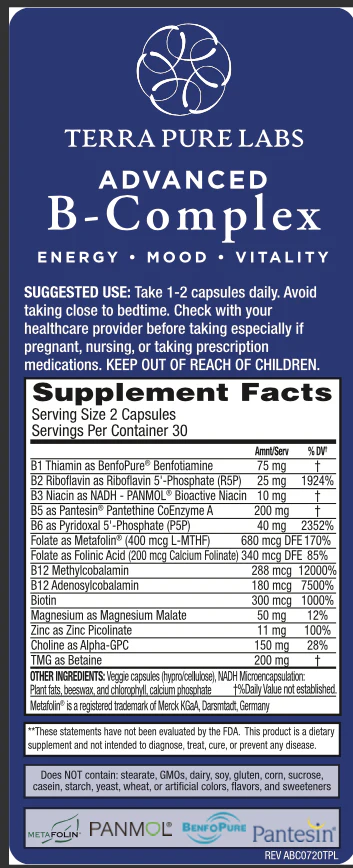 Terra Pure Labs’ Advanced B-Complex provides naturally biologically active forms that are readily absorbed and primed to be used immediately throughout the body.