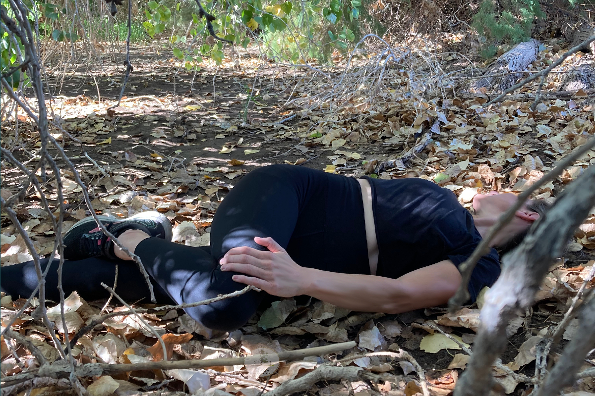 Lie on your back with your tush up against the wall. You may find a nice straight tree like we did so that your body is at a 90-degree angle.